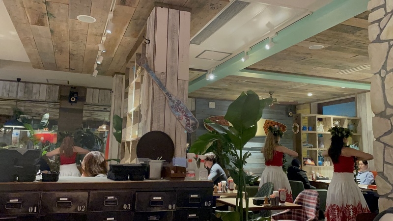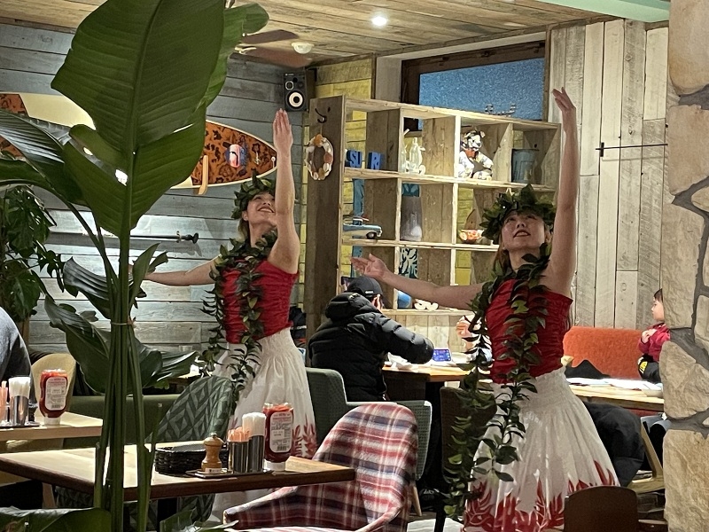 この日は雪が降っていましたが、店内はお客様がたくさんいました。食事をしながらフラを見るのは、とても楽しいですね(^^)